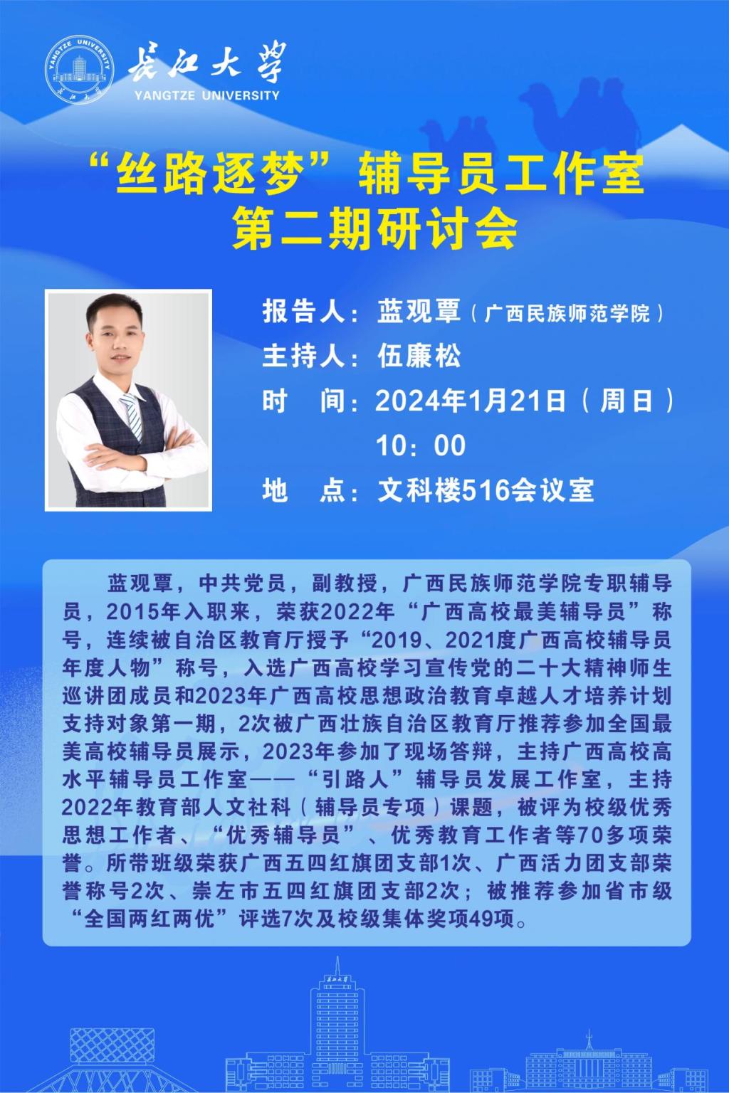 此次工作沙龙邀请广西民族师范学院“引路人”辅导员发展工作室主持人蓝观覃做经验分享。蓝教授入职来先后荣获2022年“广西高校最美辅导员”称号,连续被广西自治区教育厅授予“2019、2021年广西高校辅导员年度人物”称号,入选广西高校学习宣传党的二十大精神师生巡讲团成员和2023年广西高校思想政治教育卓越人才培养计划支持对象第一期,2次被广西壮族自治区教育厅推荐参加全国最美高校辅导员展示,2023年参加了现场答辩,主持广西高校高水平辅导员工作室——“引路人”辅导员发展工作室,主持2022年教育部人文社科(辅导员专项)课题,被评为校级优秀思想工作者、“优秀辅导员”、优秀教育工作者等70多项荣誉。