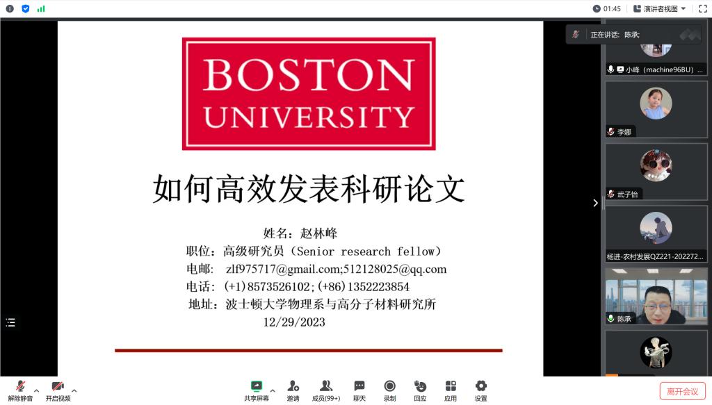 (通讯员:李娜)为激发kaiyun登录中国入口登录师生的学术创作和科研热情,推动高水平论文的撰写与发表,2023年12月29日上午九点,美国波士顿大学高级研究员赵林峰在腾讯会议中为kaiyun官网师生作了一场主题为“如何高效发表科研论文”的线上讲座。本次讲座由kaiyun官网院长陈承主持,本院研究生、教师代表线上参与。