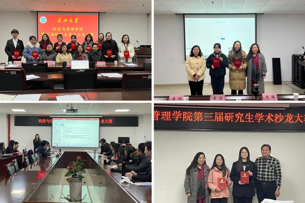 活动开始,各会场参赛同学按照论文类、文献综述类的顺序依次进行汇报。本次参赛论文选题角度多样,含括了数字经济、数字金融、乡村振兴、新型城镇化、耕地非粮化、企业数字化转型、领导完美主义的影响、税收征管、绩效评价等多个方向。现场,评委老师对同学们的论文写作水平给予认可,肯定了部分同学的选题意义,同时也对部分同学的数据处理方法、论文排版格式等提出了修改要求,强调论文写作要符合学术规范。全部同学汇报完毕后,汪发元教授做活动总结讲话,他称赞本届参赛学生的论文写作水平大有提升,也表示希望今后能多借助学术沙龙的活动平台增进师生之间的交流互动,帮助同学们进一步提高论文写作能力。会后,经过综合得分计算,本次大赛共产生4名一等奖、8名二等奖和8名三等奖,老师们为各位同学颁发获奖证书并合影留念。