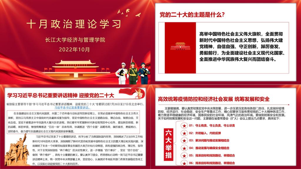 活动的主要内容包括:习近平总书记在中国共产党第二十次全国代表大会上所作的报告和发表的重要讲话精神、马克思主义中国化时代化的最新篇章——《习近平谈治国理政》第四卷及习近平总书记“7·26”讲话精神宣讲视频、中国共产党第十九届中央委员会第七次全体会议及中国共产党第十九届中央纪律检查委员会第七次全体会议精神、“深入学习贯彻习近平总书记考察湖北重要讲话精神,推进落实省第十二次党代会决策部署”专题辅导、王蒙徽在省委常委会(扩大)会议上强调:高效统筹疫情防控和经济社会发展、统筹发展和安全、以实际行动迎接党的二十大胜利召开这五项。