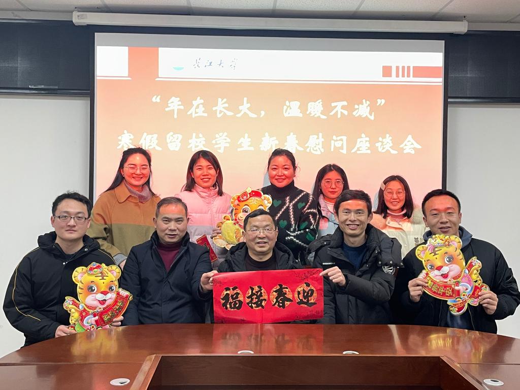 会议开始,王书记向同学们介绍了参加座谈话的各位老师,然后5名学生代表依次汇报了自己的学习、生活情况,以及春节期间的安排,樊书记亲切询问了大家春节假期的衣食住行是否便利,以及考研学习计划和实习就业情况,并叮嘱大家遵守疫情防控要求,做好时间安排,坚持学习,劳逸结合,与家长和老师保持联系,开心过春节。随后,王书记对安全问题进行了进一步强调,提醒大家有任何困难都要及时联系老师。最后,老师们一起向同学们送上了美好的新春祝福,大家一起合影留念。