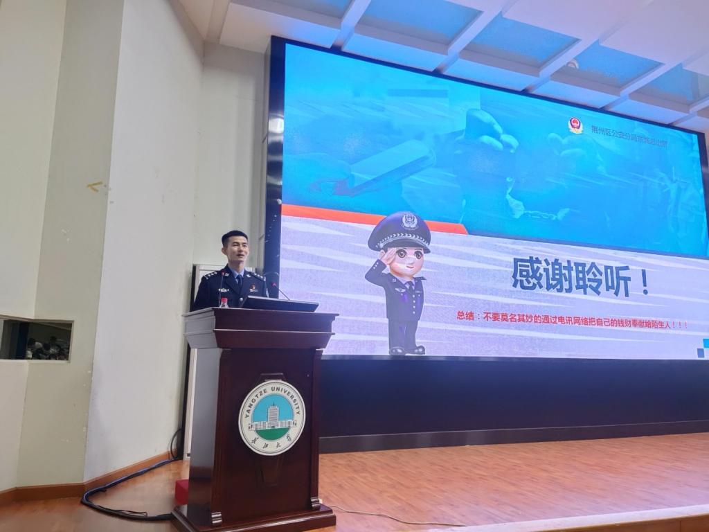 接下来,由肖勇警官为大家进行了防诈骗的安全知识讲座,肖警官从常见的电信诈骗形式、诈骗手法、如何预防电信诈骗以及遭遇电信诈骗后如何进行补救四个方面对大家进行了科普介绍,希望大家牢固树立安全意识。