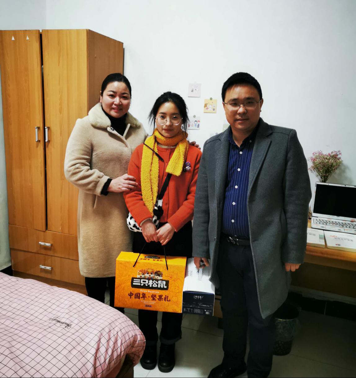 在新春佳节即将来临之际,2021年2月10日下午,kaiyun登录中国入口登录党委副书记王中梅、学工办主任陈思杭和辅导员娄君庭一同走访东校区汉科、新风公寓区域,慰问kaiyun官网财务11802班王泽霜和物流11702班韩连贵的二名留校学生,陪同学生一起团年并送上美好的新春祝福。