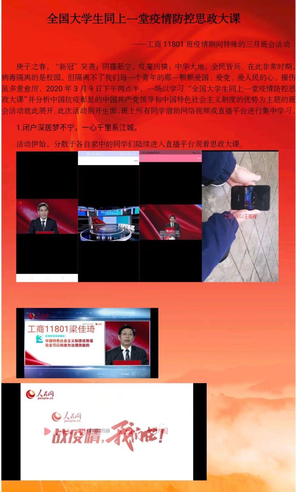 从2月7日开始,学院学工队伍全员线上上岗,实行全天候线上上班,全面推进各项工作。一是坚持到岗。学院建立了线上工作钉钉群、QQ群、微信群等网络平台,每天线上打卡,并召开了多次线上学生工作例会。二是坚持教育管理不放松。学院通过雨课堂、钉钉、QQ等网络平台开展了辅导员线上专题讲座,面向全体学生,组织各班召开了线上主题班会、学生干部会议等,传达了中央、省市、学校的防控工作要求,落实了日常教育管理工作。三是坚持育人不打烊。特殊时期,学院积极利用抗疫这一鲜活素材,推进观看师生共上一堂疫情思政课,涵养学生的爱国情怀;深化学生心理教育服务工作,开通心理咨询线上热线,主动关怀学生,积极解决学生思想问题;开展每周一次学情调查,了解学生在线学习的困难、需求与反馈,切实服务于停课不停学;深入挖掘抗疫先进典型,引导学生在参与抗疫中成长成才。