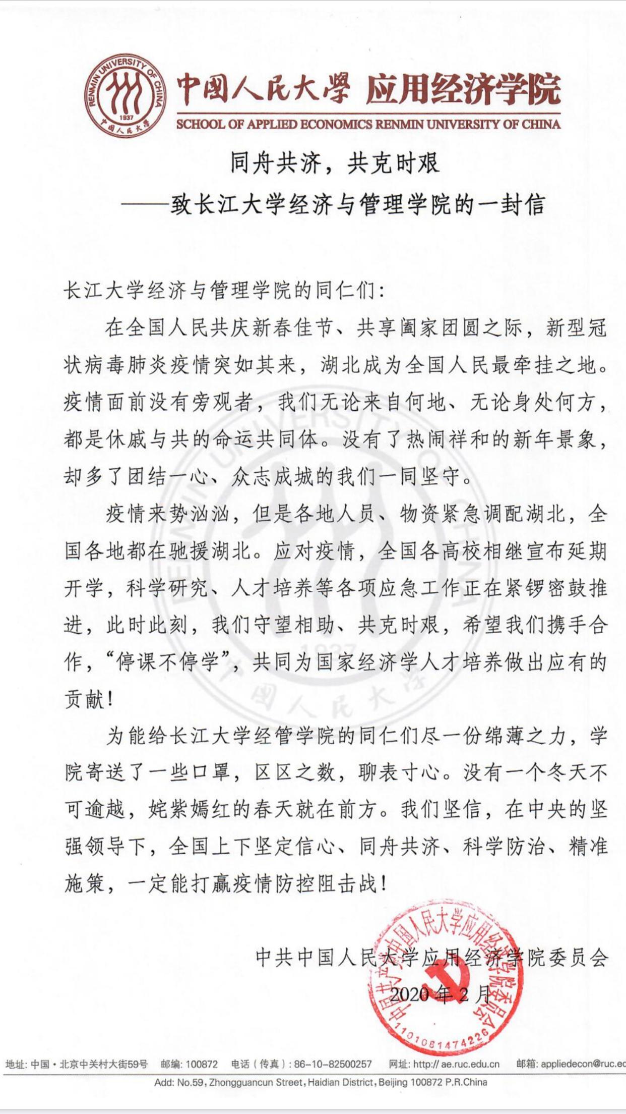 没有一个冬天不会过去,没有一个春天不会到来,虽然这场战役还没有结束,但是我们相信有党中央的坚强领导、有全国上下一心的坚守,更有许多像中国人民大学应用经济学院同仁们一样的大爱奉献,我们有信心打赢这场没有硝烟的战争,我们热切盼望春暖芳菲时,与中国人民大学同仁们相约长江之滨、古城之畔的荆州。