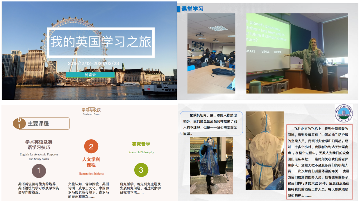“我清楚地记得老师在深夜还在统计我们的机票信息,校领导每天都在和我们开会,关注我们的身体!”苏畅感叹到。“100天的英国留学生活是一段难忘的回忆,我学习到的不仅是知识还有生活技能,也交到了一些好朋友!”谢银燕欣喜的说到。
