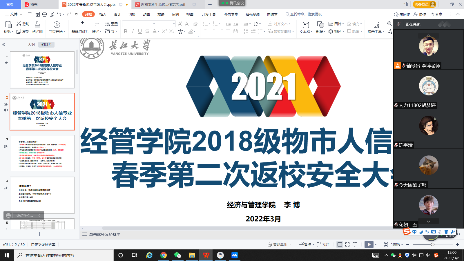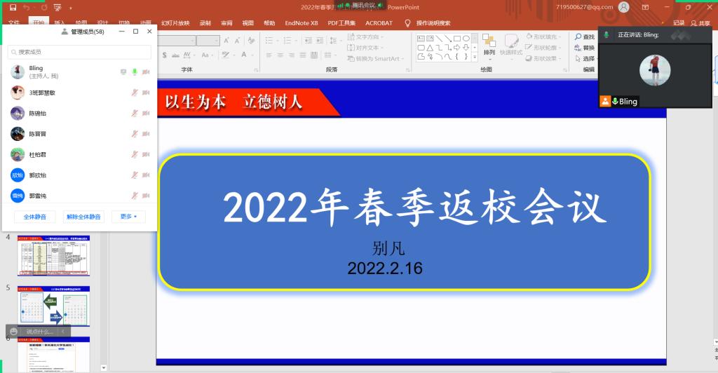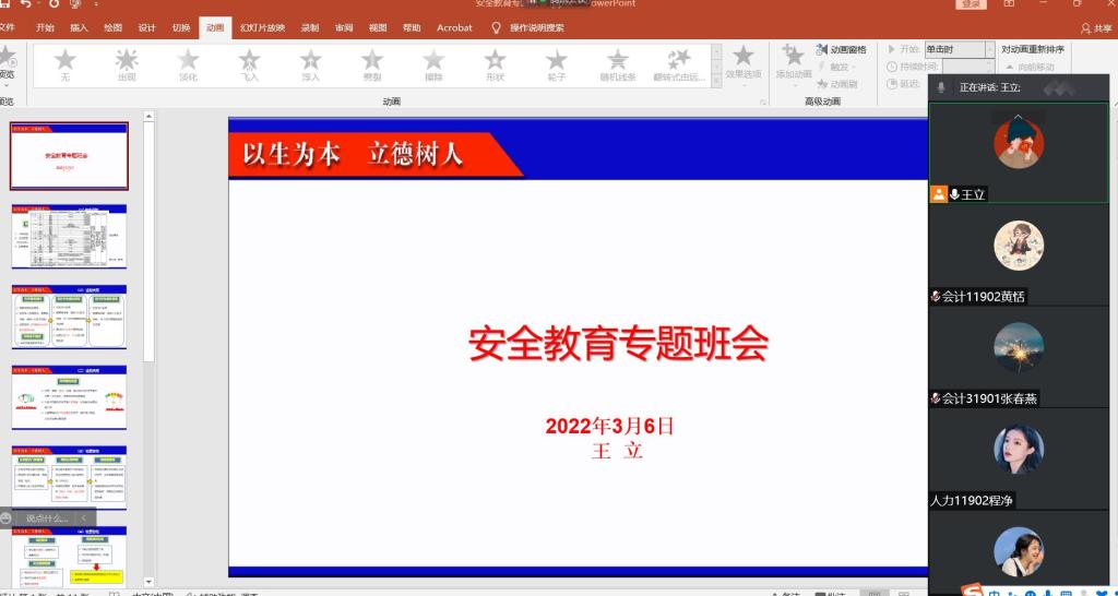 为加强学生日常安全教育管理,进一步做好疫情防控工作,确保开学以后全体学生的平安,kaiyun登录中国入口登录以班级为单位,通过线上会议的方式召开了2022年春季学期的安全教育主题班会,班主任和辅导员参加了会议。