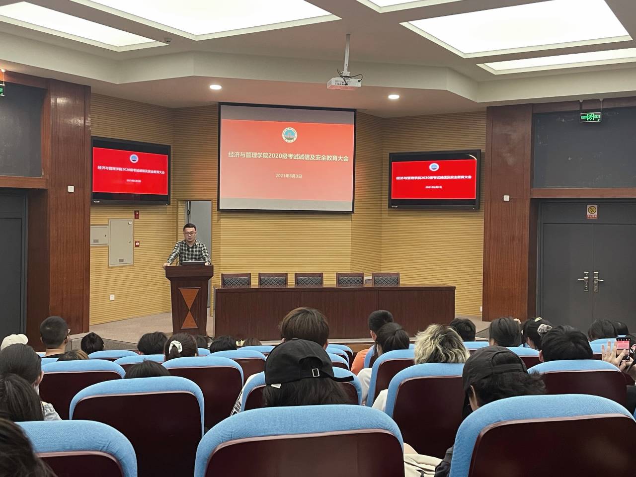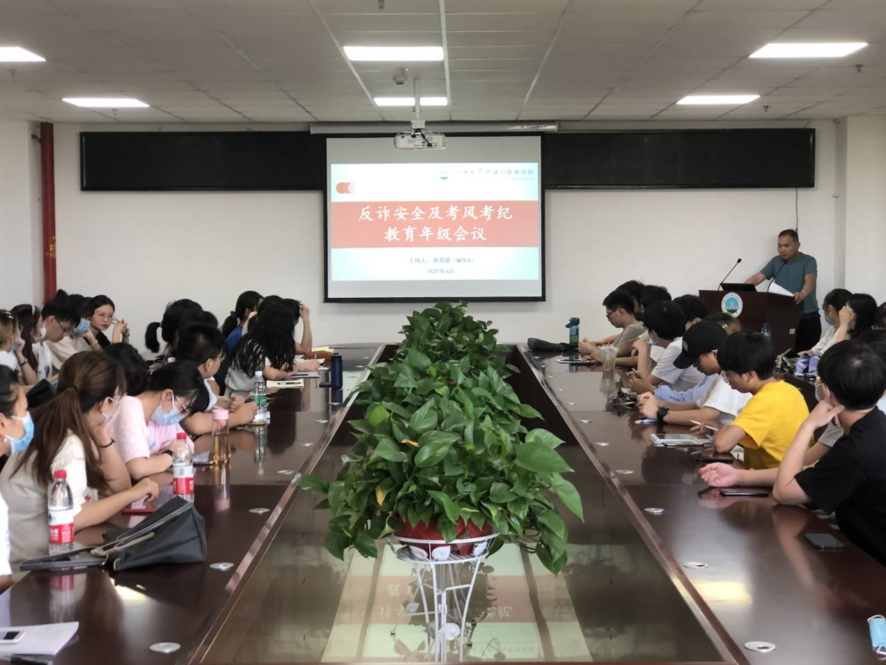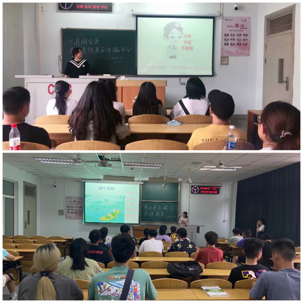 在各班的教育班会上,年级辅导员和各班班主任向同学们详细讲解防疫安全、交通安全、防溺水安全、防诈骗安全、学生宿舍的消防安全等各类安全教育知识,引导同学们树立牢固的安全观念,增强各类安全防范意识。学院要求学生统一填写假期去向统计表,出行期间主动向家长报告自己的情况,进一步保障学生的生命健康安全。随后还进行了大学生英语四六级考试和期末考试的诚信教育,通过讲解学校以往考试违纪处理的案例,进一步强调了考试纪律的严肃性,要求全体学生诚信应考。