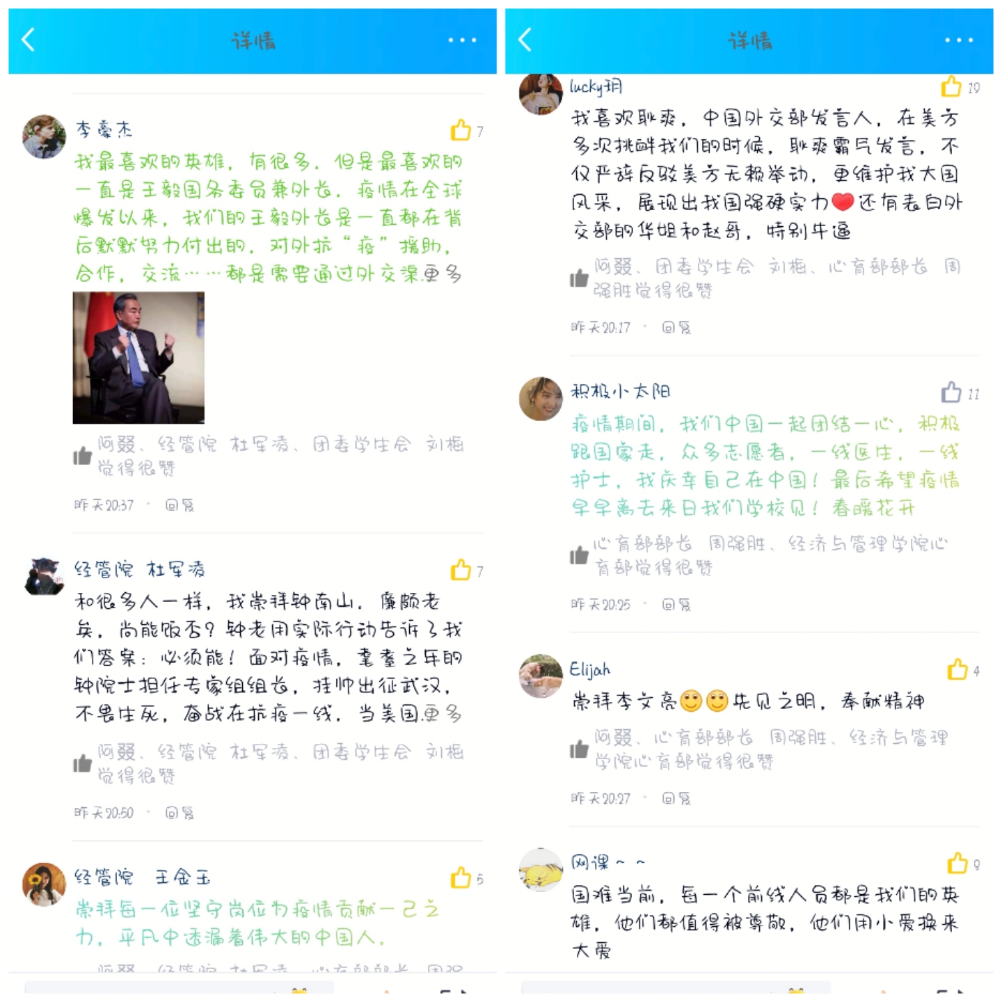 活动开展以来,全院学生积极参与。在短视频征集活动中,有的同学通过视频展现宅家期间学习的新技能;有的同学通过视频展现家庭温馨和睦氛围,如家庭影像合辑、趣味亲子活动等;有的同学通过视频展现有关抗“疫”的内容,包括患者或医务人员的抗“疫”经历、自身志愿服务经历等。在心愿墙线上互动活动中,团委学生会心育部为每日活动设置了不同的讨论话题。有分享在抗疫活动中自己最崇拜的英雄,有交流宅家期间如何调整情绪状态,有分享如何有效开展线上学习,学生们各抒己见,分享自己的感受、想法、愿望,体现了青春正能量。