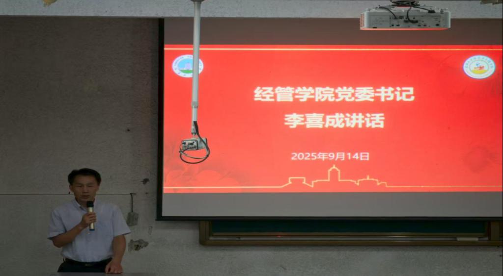 李喜成向家长们介绍了学院学生教育管理服务的理念与具体举措,他介绍了学院学生工作的整体思路,即坚持"围绕学生、关照学生、服务学生",秉承"厚爱严管"与"待生如子"的育人理念,全方位支持学生成长。他对家长提出四点建议:一是引导学生尽快适应大学学习节奏,牢牢抓住学业这一核心任务,发挥创新创业精神,树立大学期间追求;二是鼓励学生积极参与各类活动,全面提升综合素质;三是协助学生尽早进行职业生涯规划,明确未来发展目标;四是希望家长与学院、辅导员保持积极、畅通的沟通,形成家校育人合力,共同见证学生的进步与蜕变。