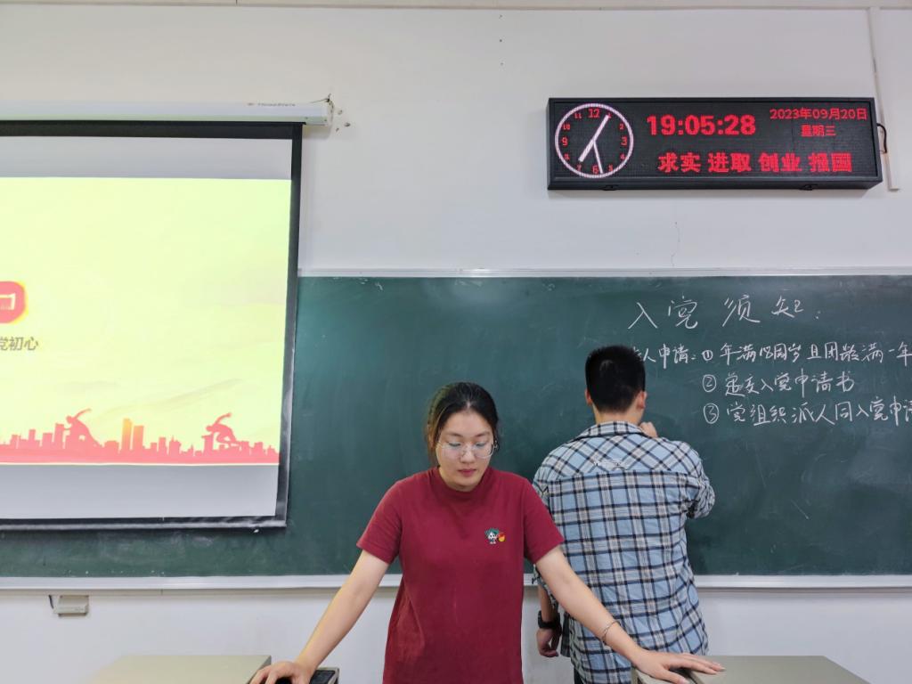 第二篇章,洪雨洁同志从入党的标准和条件、入党流程、入党申请书的撰写格式展开详细介绍。首先,向新生们介绍了入党的四个基本条件,其次,从“入党申请人-入党积极分子-发展对象-预备党员-正式党员”五个阶段介绍了发展党员的具体流程和要求,同时为新生详细讲解了入党申请书的基本格式以及入党推优的条件。