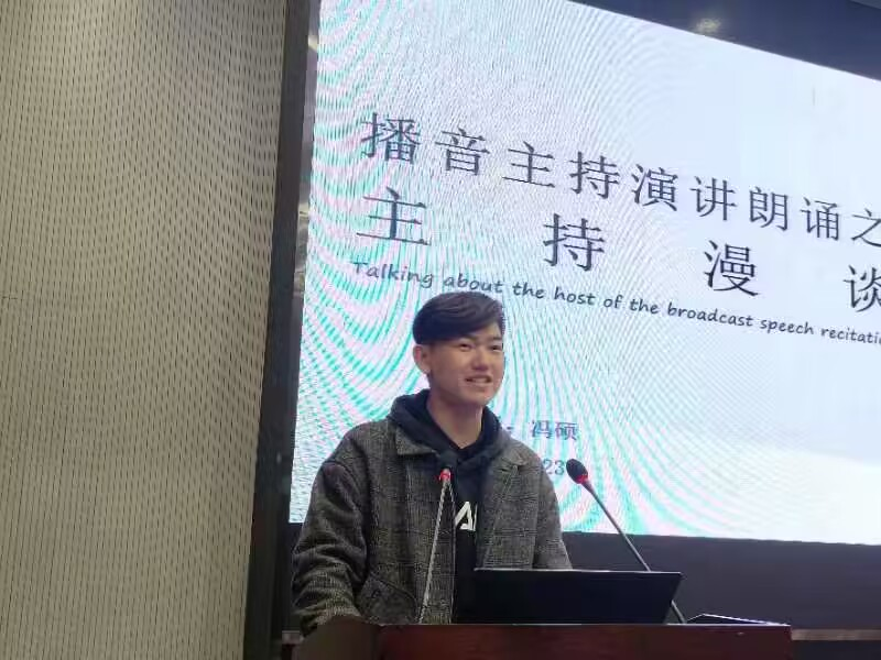 最后,冯硕学长为大家讲解会议主持、演讲与朗诵。他由主持一词引出主持人的概念,讲述了主持人的作用、演讲的技巧、朗诵的感情。
