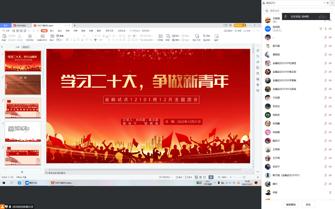 金融32201班团支部通过线上学习,更加深刻地领悟到党的二十大是一次高举旗帜、凝聚力量、团结奋进的大会,在党和国家发展进程中具有极其重大的历史意义。大家纷纷发表学习体会,进一步坚定了“六个必须坚持”、明确了中国共产党的中心任务。宣讲结束后,青年学子们再次加深了对党的二十大的认识,加强了对习近平总书记重要讲话精神的理解。