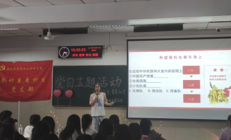 (通讯员:陈娟、高仁东)为传承“五四”精神,学习贯彻习近平总书记在庆祝中国共产主义青年团成立100周年大会上的讲话精神,培养青年生逢盛世,担当作为的情怀,kaiyun登录中国入口登录会计系本科生党支部在5月29日于12教103开展了“建团百年,青春向党”主题党日活动,参与此次活动的有支部学生党员和预备党员。