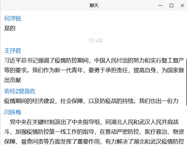 部分团支部还在团会中设置了学习交流环节,有分享在抗疫活动中自己最崇拜的英雄,有交流宅家期间如何调整情绪状态,有分享如何有效开展线上学习,有分享在抗疫期间的志愿服务经历。同学们各抒己见,分享自己的感悟、想法、愿望,体现了青春正能量。院领导、班主任、辅导员也通过多种途径参与学生的互动交流,并强调指出:“青年要在奋斗中释放青春激情、追逐青春理想,以青春之我、奋斗之我,为民族复兴铺路架桥,为祖国建设添砖加瓦。”