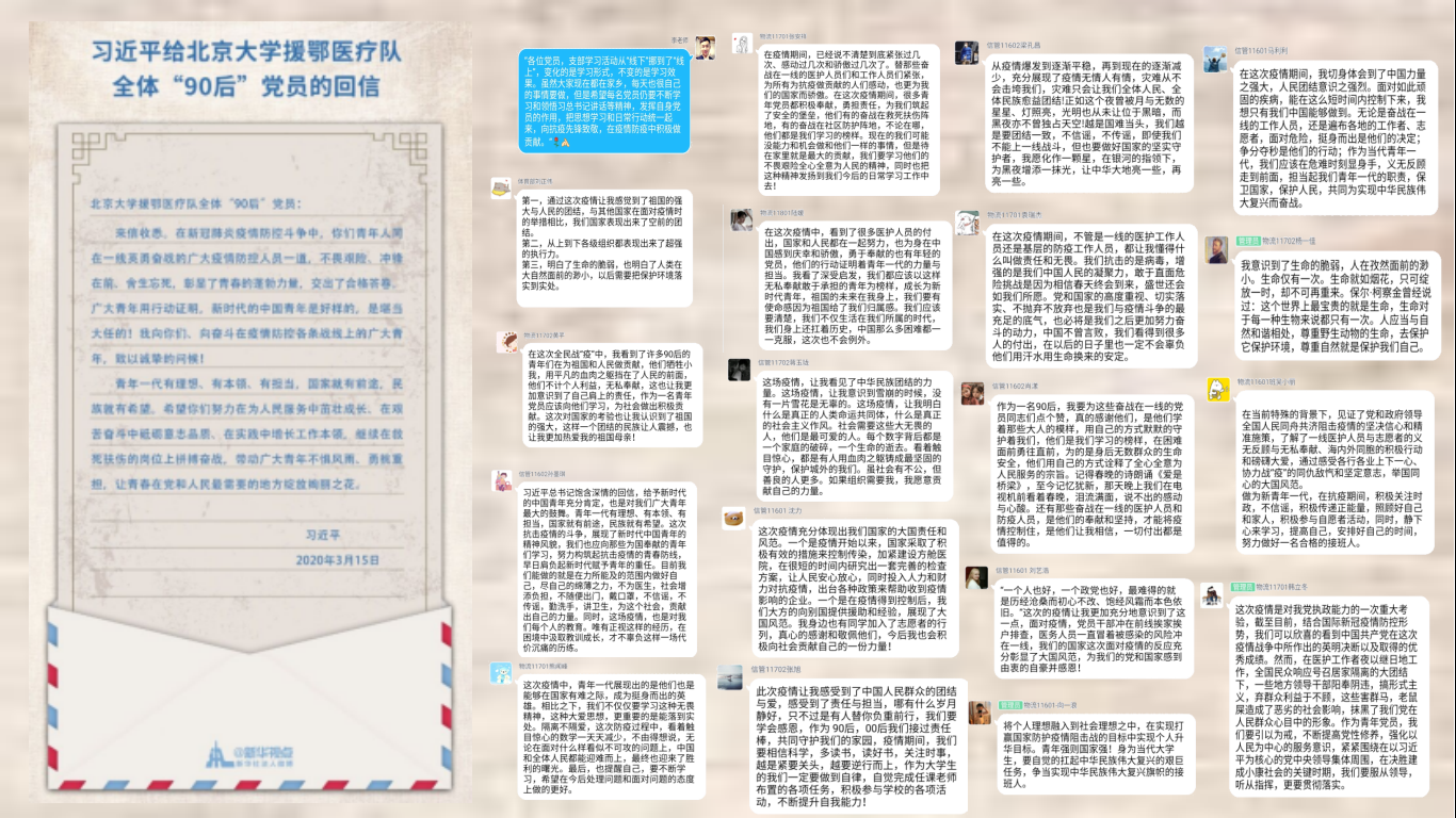 本次线上活动围主要绕习近平总书记给北京大学援鄂医疗队全体“90”党员回信内容进行集体讨论。全体学生党员对信中内容进行交流,并结合自身的经历和见闻发表看法。面对疫情,各位学生党员表示都能坚守自身党员的职责和义务,通过各种方式积极参与到防疫工作中。