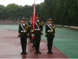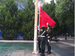 6时50分,全体与会成员准备就绪。7时整,在全体师生的注目下,国旗护卫队队员们踏着整齐的步伐,一路将国旗护送到升旗台,升旗手有力的手臂将鲜艳的国旗上扬抛出,伴随着庄严的中华人民共和国国歌,五星红旗冉冉升起,迎风飘扬。