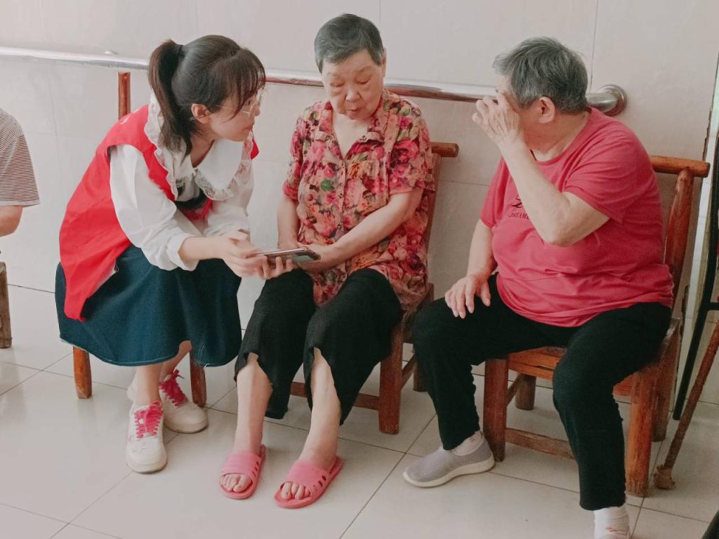 在福利院工作人员的带领下,志愿者们来到了老人们居住的楼栋,大家急忙帮着打扫卫生、收拾床铺。看到老人们坐在大厅内休息,志愿者们便去到了老人中间,陪老人们聊起了家常,人群中时而传来笑声,现场氛围十分热闹。志愿者张思彤是一位山东姑娘,她打开手机相册,向身旁的老人们分享了自己家乡的美景和美食,活动结束后她开心地和大家说到:“没想到爷爷奶奶对我的家乡这么感兴趣,他们很认真地在听我进行介绍,还问了我很多问题,我们好像是打开了一个话匣子,而爷爷奶奶的脸上也总是挂着笑容,我觉得这次来的值了。”