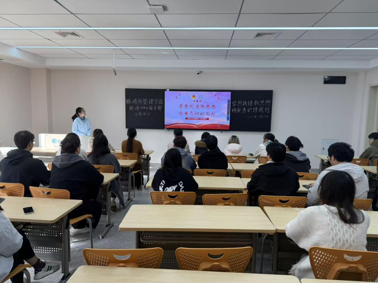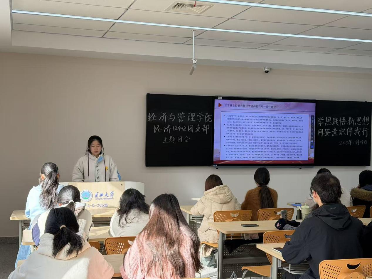 团课学习紧扣“学思践悟新思想,网安意识伴我行”主题,围绕理论学习、使命践行与网络安全教育三大模块展开。在“学习习近平总书记重要讲话和重要指示批示精神”专题中,主讲人满馨语系统解读了党的二十届四中全会公报等重要文献,引导成员准确把握国家发展蓝图。随后,学生代表王靓颖结合经济学专业背景,分享了将党的创新理论融入学业规划的思考与体会。