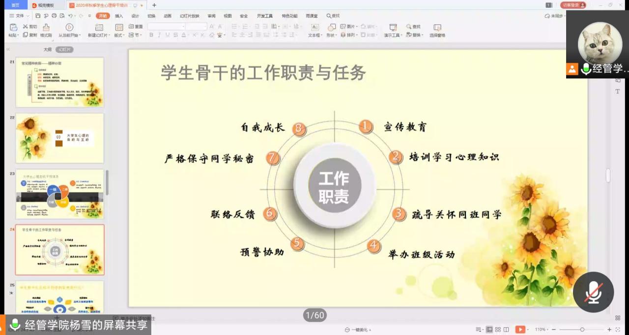 (通讯员:王巧)为进一步提高大学生心理素质,营造健康积极的心理教育氛围,9月22日--23日,kaiyun登录中国入口登录通过腾讯会议方式,分三场开展了学院学生心理骨干培训。培训由学院学生心理专干杨雪老师主讲,学院各班级班长、团支书、心育委员、安全委员、寝室长等学生干部参加了本次培训。