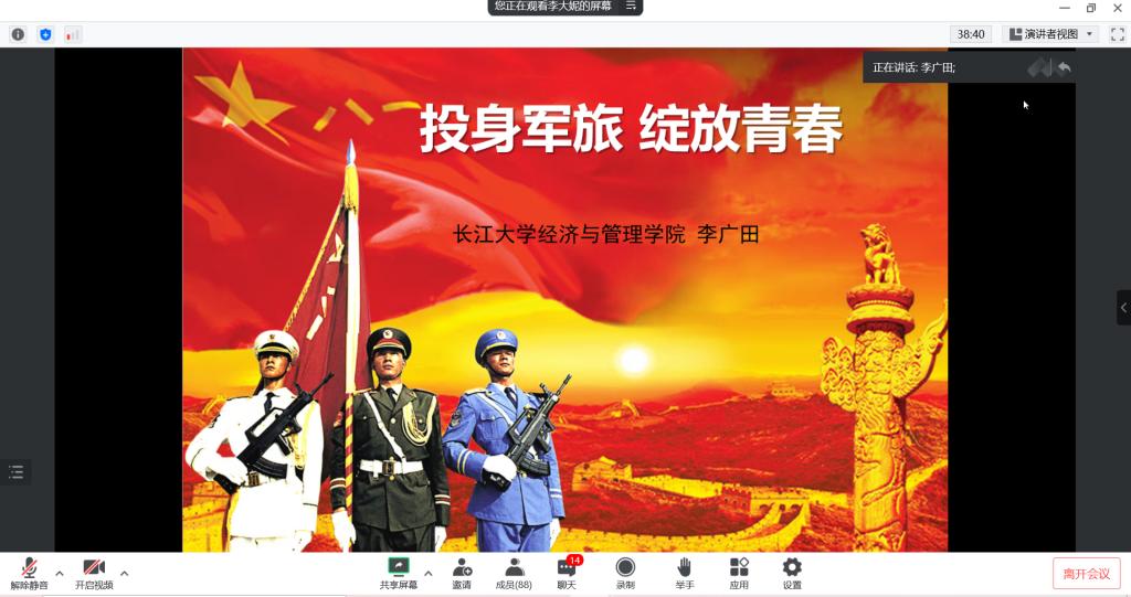 退伍士兵李广田同学为大家分享了属于他的军旅生活他从部队生活的经历以及退伍后的生活进行了分享通过他的讲述,让同学们了解到部队生活的难忘和退伍后生活的精彩。李广田同学丰富的经历不忘初心的信念和积极进取的上进心,为参会各位同学树立了很好的榜样。