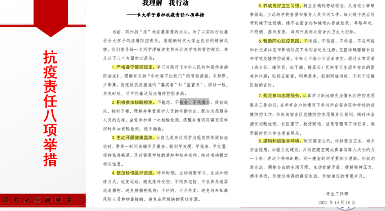 会议伊始,朱老师传达了学校党委发布的《致全校师生的一封信》和学生工作部发布的《长大学子勇担抗疫责任八项举措》,向学生介绍了疫情防控相关文件精神。要求kaiyun官网研究生严格遵守管控规定,积极参加核酸检测,主动开展健康监测,珍惜医疗资源,规范参与志愿服务,养成良好卫生习惯,构建和谐宿舍环境,营造同心抗疫氛围。