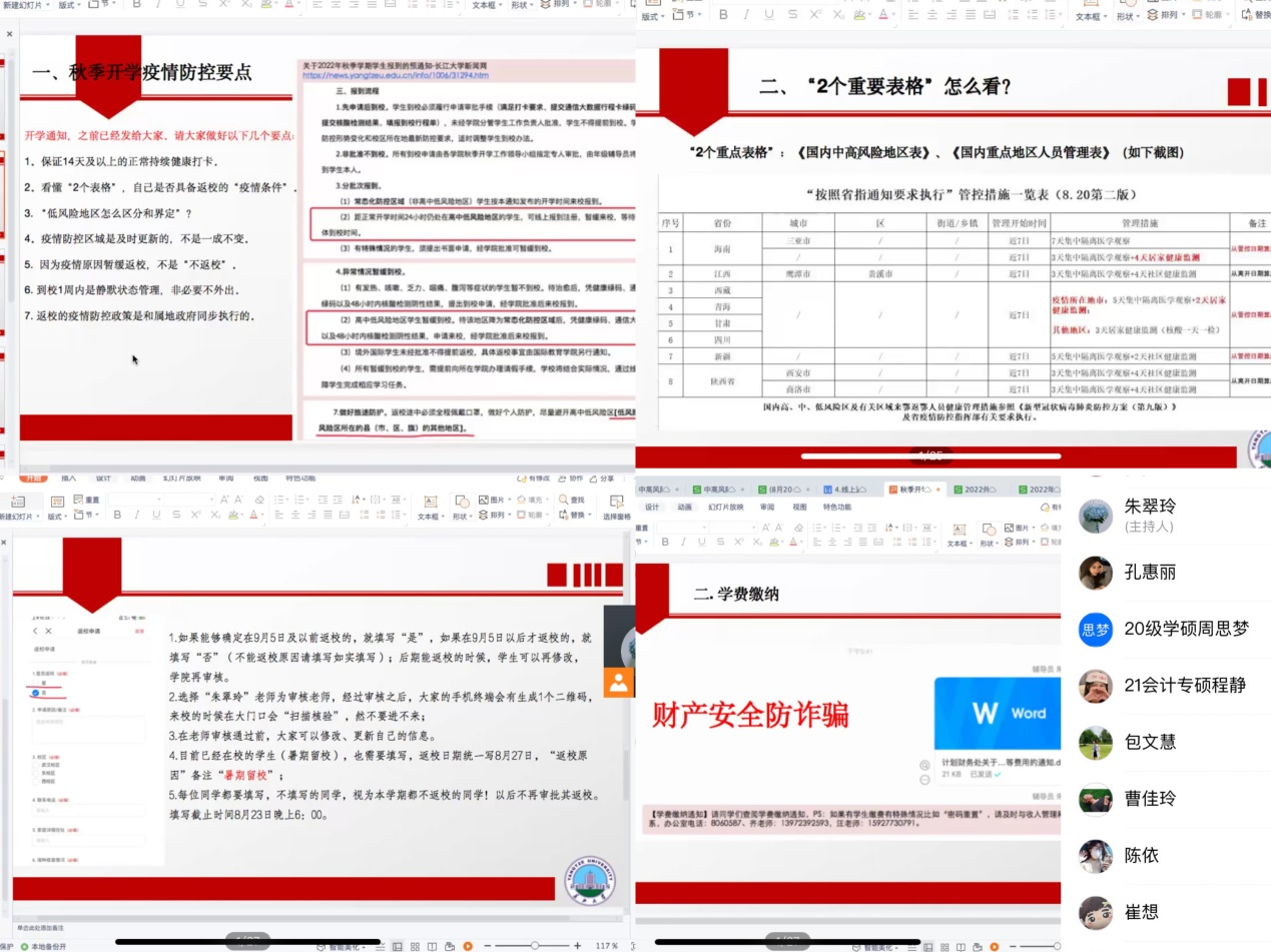 (通讯员:付玉婷)为切实做好开学疫情防控工作,确保秋季开学各项工作有序开展,kaiyun官网于8月21日晚,通过线上方式召开2022年秋季研究生返校工作会议。会议由经管院辅导员朱翠玲主持,kaiyun登录中国入口登录全体研究生参与。