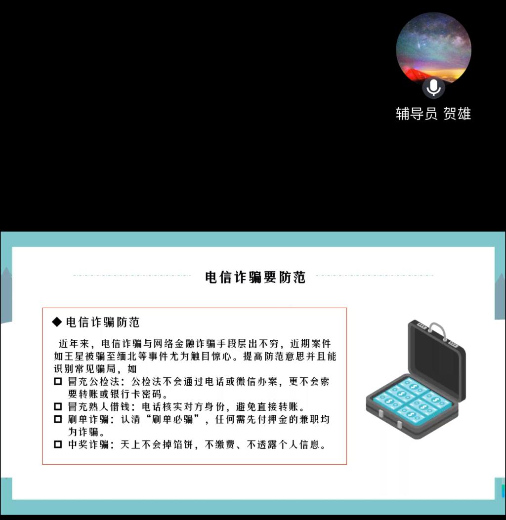 鉴于当前电信诈骗案件频发,贺老师通过生动具体的案例分析,向同学们深入剖析了电信诈骗的常见手法与防范策略,警醒大家提高警惕,不轻信来自陌生人的电话、短信及网络信息,切实保护好个人隐私与财产安全。此外,他还特别强调了金融风险的防范意识,提醒同学们谨慎参与各类金融投资活动,避免陷入非法集资等金融陷阱。