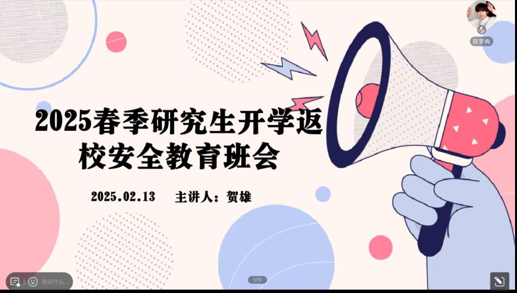 (通讯员 陈梦冉)为切实提升研究生的安全意识,确保新学期校园生活安全有序开展,学院于2025年2月13日下午成功召开了研究生春季开学返校安全教育班会。此次班会由辅导员贺雄老师主持,全体研究生参加会议。