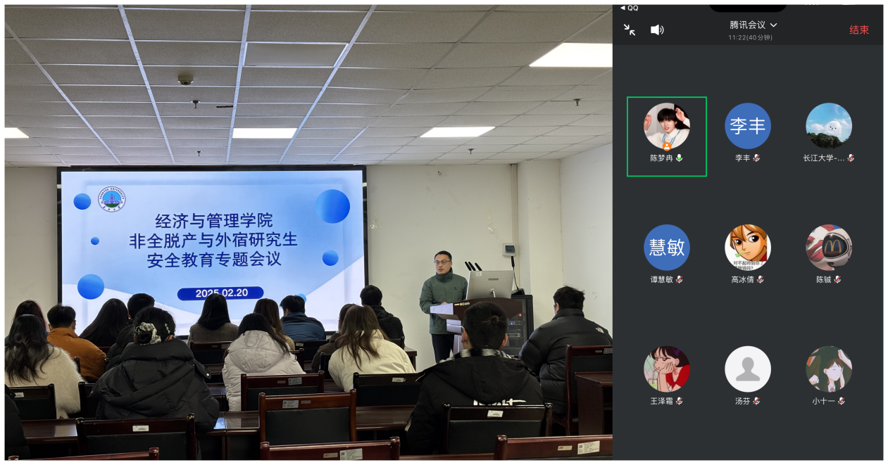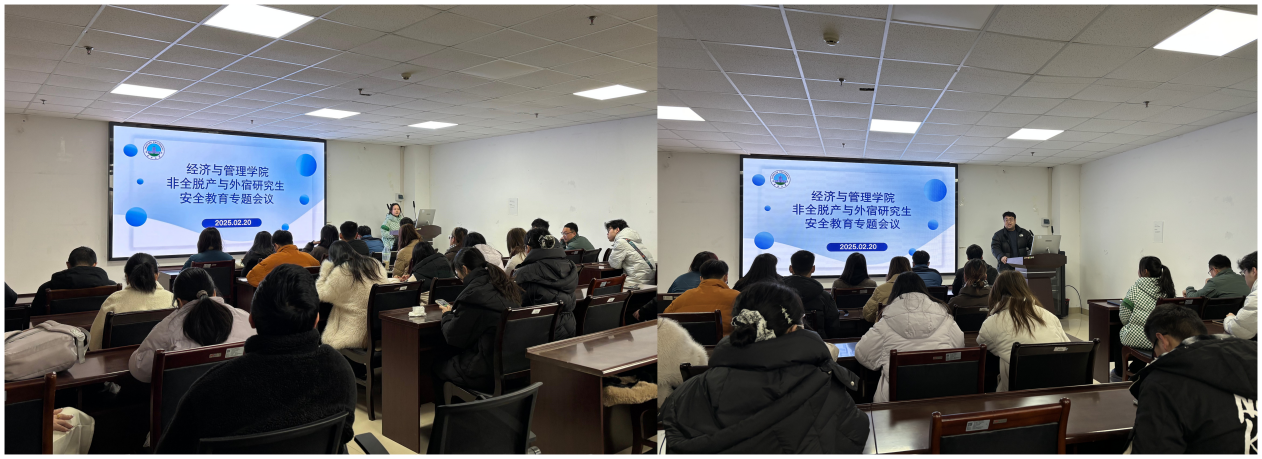 (通讯员 谭敏)2025年2月20日,学院成功举办了针对外宿与非全脱产研究生的安全教育专题会议。此次会议采取线上和线下相结合的方式,会议由研究生辅导员贺雄老师主持,全体外宿与非全脱产研究生参加会议。