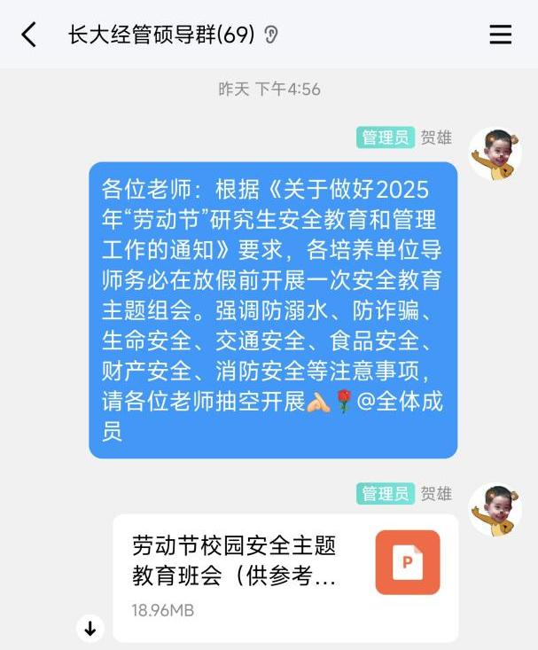 (通讯员 陈梦冉)五一劳动节假期临近,为切实增强研究生安全意识,学院通过主题班会、宿舍宣讲、导师组会、外宿走访等多种形式,全面开展假期安全教育工作。