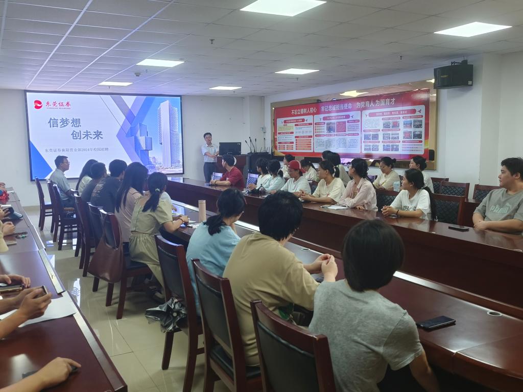 签约仪式后,襄阳东莞证券股份有限公司在学院开展了人才招聘宣讲会。王凌菲从选择证券行业的原因、公司介绍、工作收获以及秋招要求等方面,为学生作出详细讲解,让大家充分了解到东莞证券有限公司。会上,企业代表还与在座学生分享了投资教育知识,与在场学生进行深入交流。