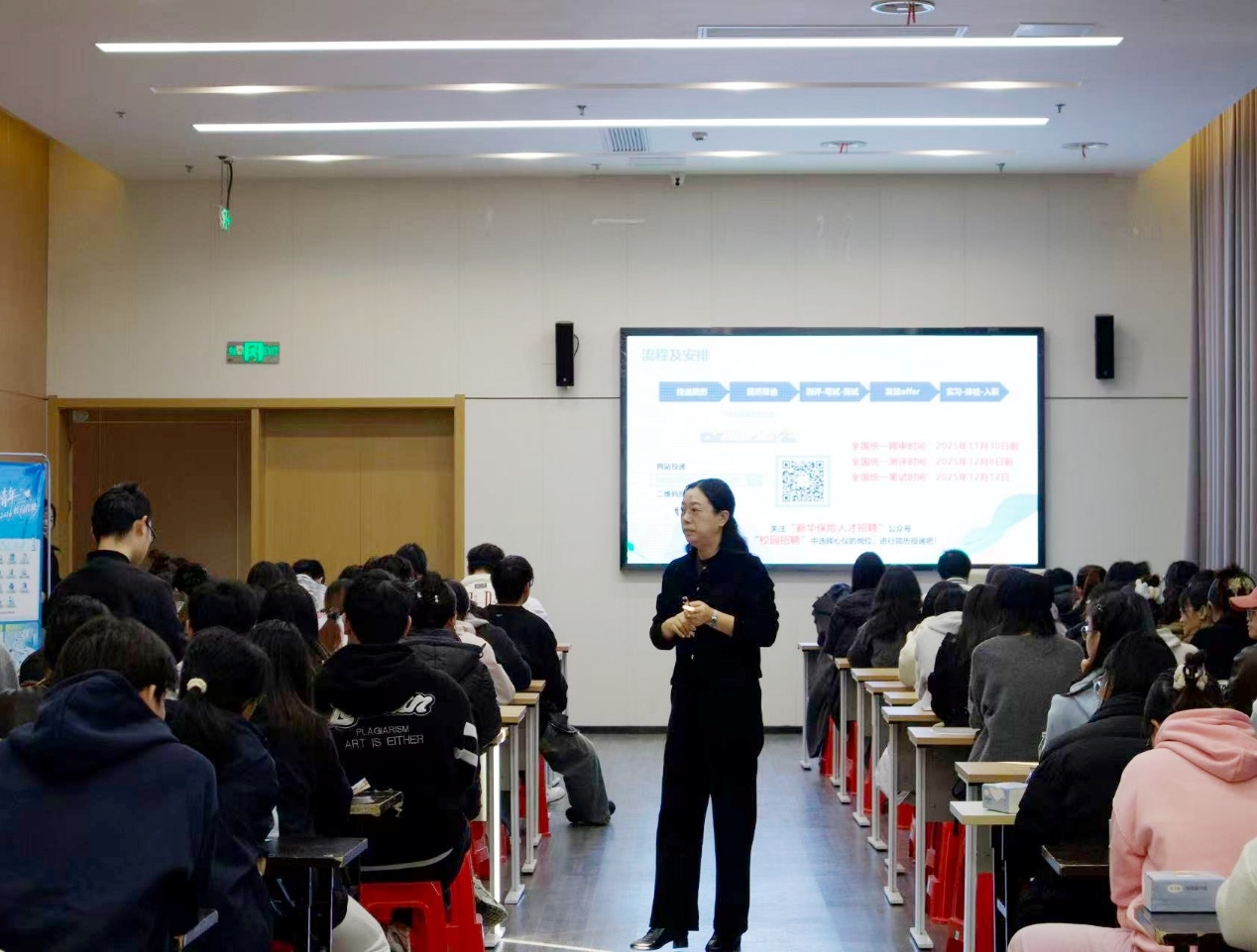 随后,各企业代表依次上台进行招聘宣讲。通过图文并茂的展示,企业代表们详细介绍了企业发展历程、核心业务、文化理念及招聘需求,特别针对法学相关岗位(如法律事务专员、合规顾问、风控助理等)的职责要求、专业能力标准进行了重点解读,充分展现了行业前景与对复合型、专业型人才的重视。宣讲过程中,企业代表们与经管、法学专业学生互动频频,针对 “金融行业法律风险防控”“企业合规体系建设” 等跨领域问题展开深入解答,现场气氛热烈,掌声不断。