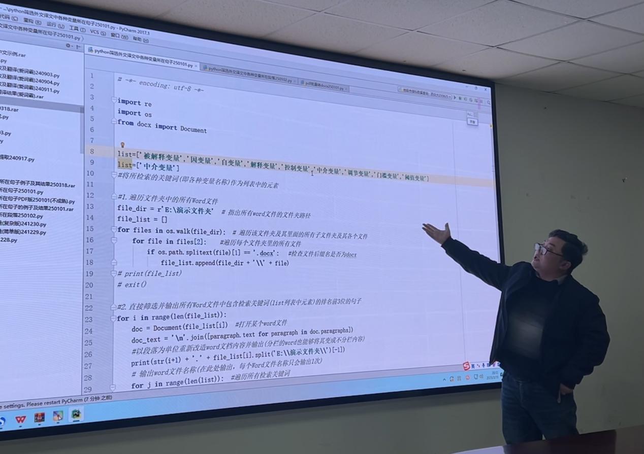 会议伊始,孔令成博士深入阐述了软件学习的重要意义以及Python软件的实用性。随后,他进行了Python和Pycharm安装的“手把手”教学,过程详细且思路清晰。安装检验成功后,他将两个软件进行融合,并在Pycharm中运用代码对论文中的变量指标进行筛选。这一过程旨在帮助同学们在论文写作中把握全局,开拓学术视野,提升写作层次,提高撰写效率。