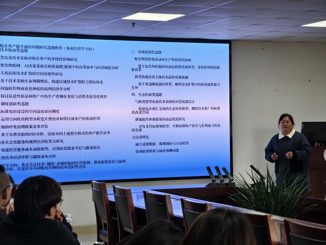 曾靖副教授以“基于区域差异的提升粮食单产的路径研究”为主题,结合相关政策文件和世界粮食的供需现状,阐述了粮食安全不仅是经济问题,更是国家战略的重要支点,深刻揭示了研究粮食安全这一课题的重要性和现实性。然而,区域发展失衡与资源约束条件导致粮食生产系统存在结构性矛盾,粮食安全也面临着诸多挑战。但通过跨学科合作研究,不仅能为破解区域差异对粮食单产潜力的制约提供新视角,更能通过技术创新与政策工具的协同作用,为粮食生产研究开辟创新路径。