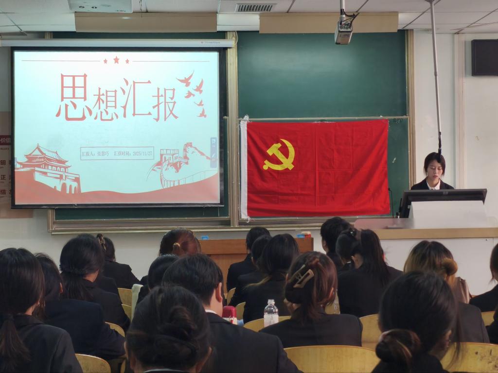 思想汇报环节,张慧巧同志结合学习党的二十届四中全会精神,分享了思想成长历程。她表示通过在专业学习、团支部工作及各类实践中的锻炼,增强了综合素质,同时也认识到理论学习深度不够、工作细节把握不足等问题,将通过制定学习计划、加强复盘总结等方式持续改进,以党员标准严格要求自己。